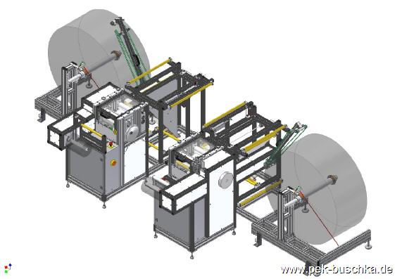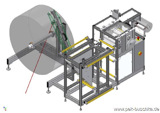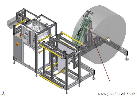 | Die Fertigungsanlage für Röllchen ist in Modulbauweise konzipiert und ermöglicht dadurch vielfältige Fertigungsvarianten der Röllchen. Durch das aneinanderreihen einzelner Module oder das Auswechseln einzelner Baugruppen in den Modulen werden die Fertigungsfunktionen der Maschine bestimmt. |