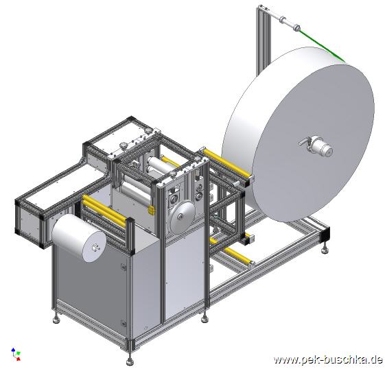 Mit dieser Maschine werden Röllchen ohne Längsfalz gefertigt. Der perforationsabstand ist zwischen 150 mm und 300 mm in 5 mm Schritten einstellbar. Die Anzahl der Blätter in einem Röllchen ist frei wählbar und nur durch den maximalen Röllchen-Außendurchmesser von 200 mm begrenzt. Diese Maschine arbeitet von links nach rechts und ist mit folgenden Funktionsmodulen ausgestattet: Angetriebene Abwickelvorrichtung für die Mutterrolle Längsfalzvorrichtung mit Bahnkantensteuerung |