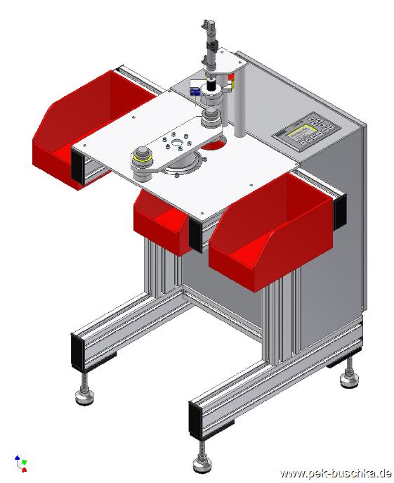 Mit dieser Maschine werden Bremsscheiben passgenau zusammengefügt. Eine Bremsscheibe besteht aus einem Trägerring und zwei Bremsbelägen, die unten und oben am Trägerring angeklebt werden. Die Position der Bremsscheiben zum Trägerring unterliegt engen Fügetoleranzen. Mit der dargestellten Maschine ist dies auf einfache Weise möglich. |