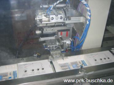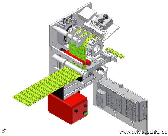 Diese Vorrichtung wurde für eine bestehende Fertigungsanlage für medizinische Produkte entwickelt. Mit dieser neu entwickelten Vorrichtung werden in Folie eingepackte Strohhalme vorgezogen, abgeschnitten und in eine Falzschachtel eingelegt. |